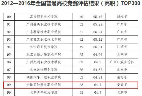 beat365在2012-2016全国普通高校竞赛评估结果高职院校组TOP300中名列第99位,挺进全国100强。