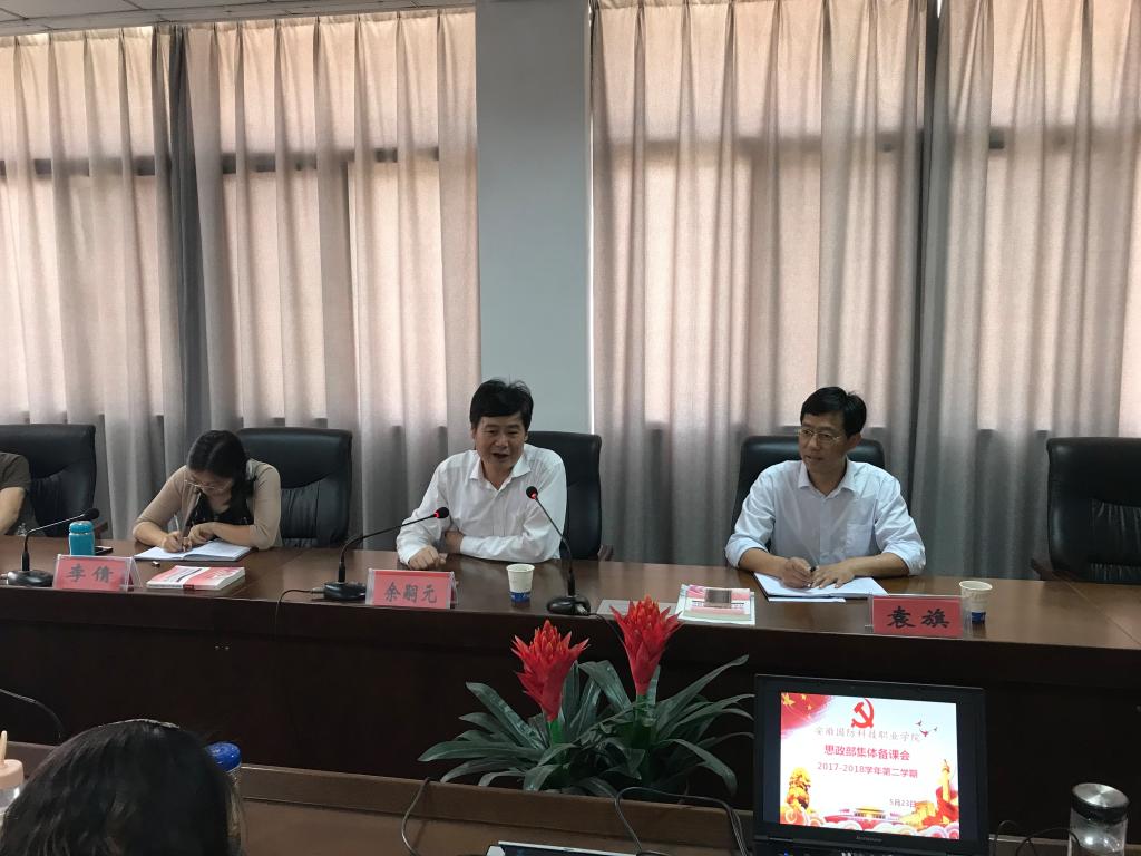 本网讯 5月23日下午,思政教学部在行政楼403会议室进行了2017-2018学年第二学期《毛泽东思想和中国特色社会主义理论体系概论》新教材集体备课会暨学习习近平总书记在纪念马克思诞辰200周年大会上的重要讲话精神专题会。校党委书记余嗣元出席会议并讲话,思政部全体专兼职教师参加了会议。会议由校党委委员、宣传部长、思政部主任袁旗主持。