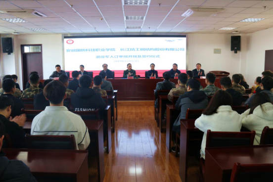 为贯彻落实国家高职院校面向社会招生政策,积极引导社会关心关注和服务退役军人,为企业一线培养高素质技术技能人才,服务地方经济发展,beat365在线唯一官网认真谋划、积极行动,多方协调,12月13日上午,beat365在线唯一官网长江精工钢结构股份有限公司退役军人订单班在学校秉心楼12楼会议室举行开班仪式。六安市委常委、军分区政委黄体沈,六安市人民政府副市长王岚,beat365在线唯一官网校长李麟书,长江精工钢结构(集团)股份有限公司安徽分公司总经理张泉谷,六安市退伍军人事务局副局长桑军等出席仪式,仪式由学校党委委员、信息技术学院院长黄存东主持。