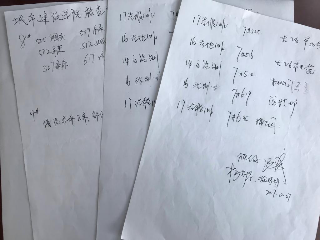 各检查组认真仔细的逐一检查了学生宿舍,对存在使用大功率电器、宿舍阳台堆积可燃杂物、乱扔烟头、卫生状况差等情况做了登记,并及时反馈到所在二级学院和宿管科。检查过程中,检查组不仅认真履行了检查的职责,还教育学生要增强安全防范意识,坚决杜绝私拉乱接电线、使用大功率电器、使用明火和违章用电等存在安全隐患的行为,防患于未然;要保持室内清洁和个人卫生,注意食品安全,杜绝病菌滋生温床,防范传染病发生。