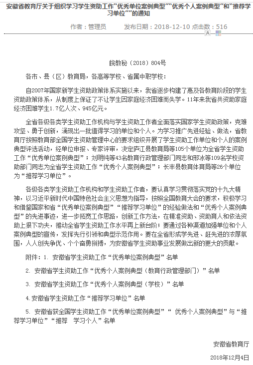 近日,由安徽省教育厅组织评选的全省学生资助工作“优秀单位案例典型”、“优秀个人案例典型”评选结果揭晓,beat365被授予“优秀单位案例典型”荣誉称号,校学生处资助管理中心杨超被授予“优秀个人案例典型”荣誉称号。