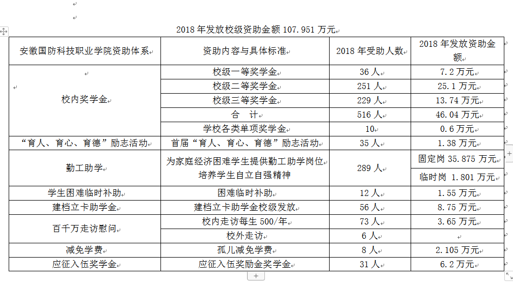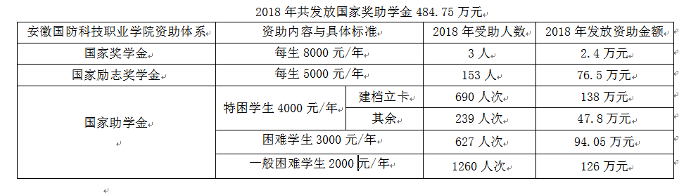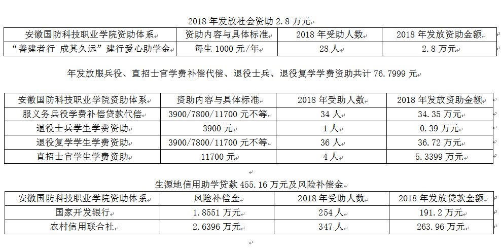 2018年学校学生资助工作在省教育厅资助中心和学校党政的正确领导下,坚持公平、公正、公开的资助工作原则,通过奖、助、贷、勤、免等多种途径,开展学生资助工作。全年共评审发放国家奖助学金484.75万元;发放校级资助金额107.951万元;社会资助2.8万元;发放服兵役、直招士官学费补偿代偿、退役士兵、退役复学学费资助共计76.7999万元。2018年度学生资助共计享受4712人次。全年无一人因家庭经济困难原因辍学,学生资助工作实现了零投诉。