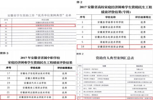 上图为学校荣获安徽省学生资助工作“民生工程绩效评价高校、中职双优等次;