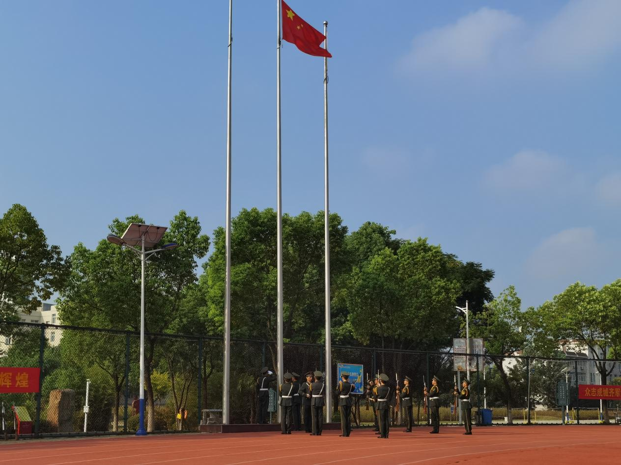 大会伊始,国旗护卫队的同学们踏着铿锵有力的步伐,护送五星红旗入场。在庄严的国歌声中,开学典礼拉开了序幕。全体师生行注目礼,齐声高唱国歌,鲜艳的五星红旗冉冉升起、迎风飘扬。