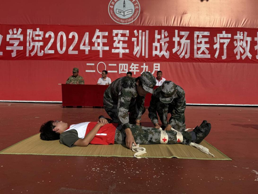 本网讯(人武部 光子木)为深入学习贯彻党的二十届三中全会精神和习近平总书记关于安全的重要论述,牢固树立“人民至上、生命至上”理念,积极开展“救在身边、护好校园”行动。9月24日下午,学校在运动场开展2024年军训战场医疗救护科目训练大比武,校学生处(人武部)处(部)长孙武、六安市红十字救援队队长胡宏、金安区人武部总教官卫功正担任评委、全体2024级新生现场观摩此次比武。