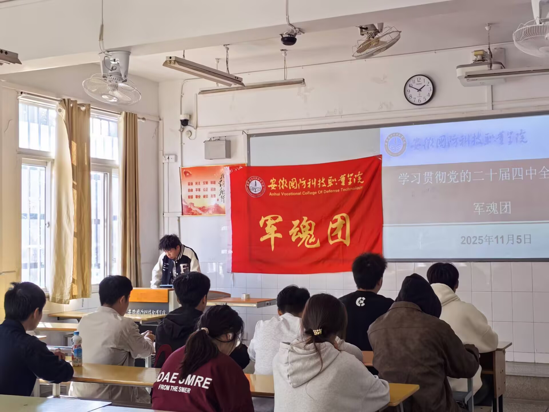 本网讯(学生通讯员 唐红斌)11月5日,军魂团功能型团支部组织开展学习党的二十届四中全会精神主题教育活动,重点学习习近平总书记关于国防和军队建设重要论述,全体团员青年齐聚一堂,共同领悟强军思想的深刻内涵,厚植国防情怀。