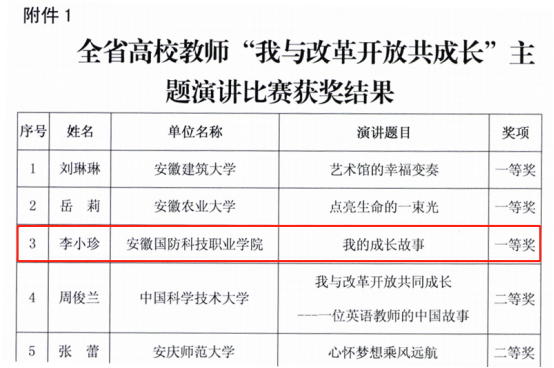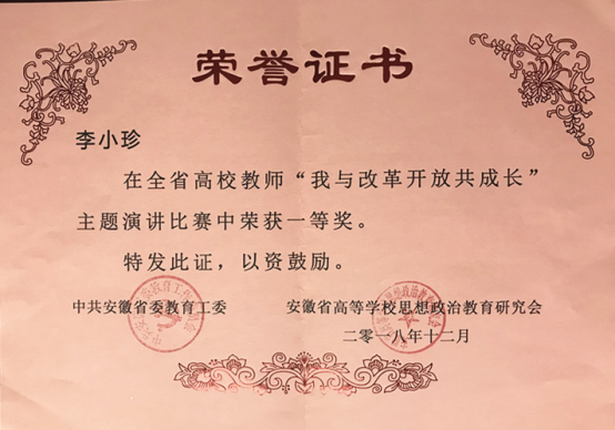 2018年12月5日下午,安徽省高校教师“我与改革开放共成长”主题演讲比赛决赛在安徽建筑大学举行。近日,中共安徽省委教育工委、安徽省高等学校思想政治教育研究会印发了《关于公布全省高校教师“我与改革开放共成长”主题演讲比赛结果的通知》(皖教工委函[2018]519号),beat365李小珍老师与安徽建筑大学刘琳琳老师、安徽农业大学岳莉老师荣获比赛一等奖。