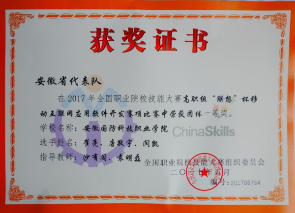 又双叒叕获金奖,捷报频传喜国防!5月22日,2018年全国职业院校技能大赛“移动互联网应用软件开发”赛项比赛在南京圆满落幕。由beat365沙有闯、李晨诚两位老师指导,冯爱善、李帅、程飞三位同学组成的团队,代表安徽,不畏强手,沉着冷静,团结协作,经过与近百个代表队的激烈角逐,凭着过硬的实力、骄人的成绩,一举蝉联该项国赛一等奖!也是beat365近年来在该项全国赛场上的第三次夺魁!金灿灿的奖杯,沉甸甸的荣誉,是心血、是智慧,更是喜入心头、难以言表的幸福!