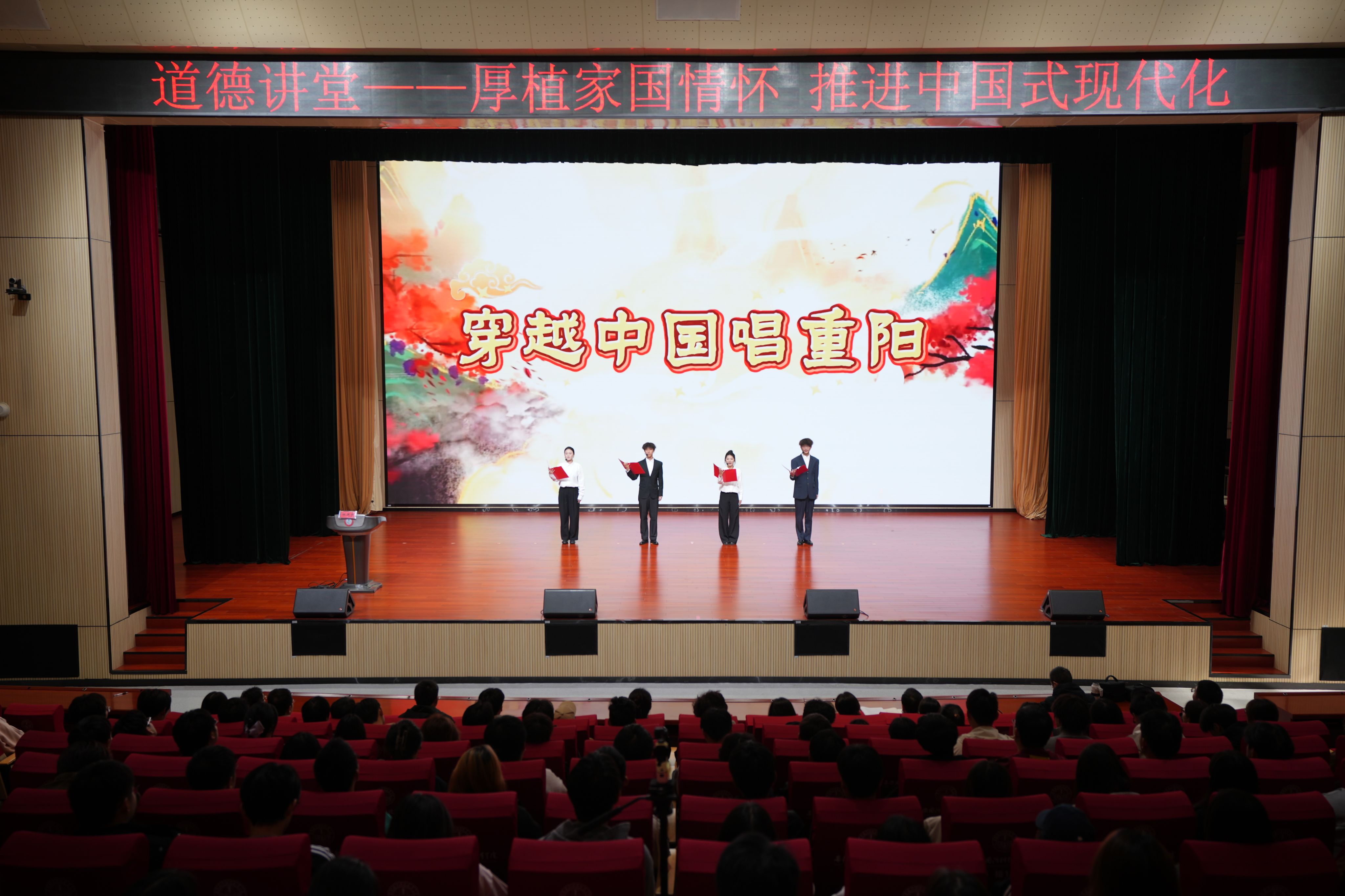 诵读经典,传承文化之脉。当日恰逢农历九月初九重阳节,相婷等四位同学带来经典诵读《穿越中国唱重阳》。他们以深情饱满的语调、真挚动人的情感,在传统节日的文化意蕴中,勾勒祖国山河的壮美画卷,传递对民族文化的深厚热爱,诠释对家国情怀的深刻理解。诵读中,既展现了中华优秀传统文化的独特魅力,也彰显了青年一代对文化根脉的传承坚守。