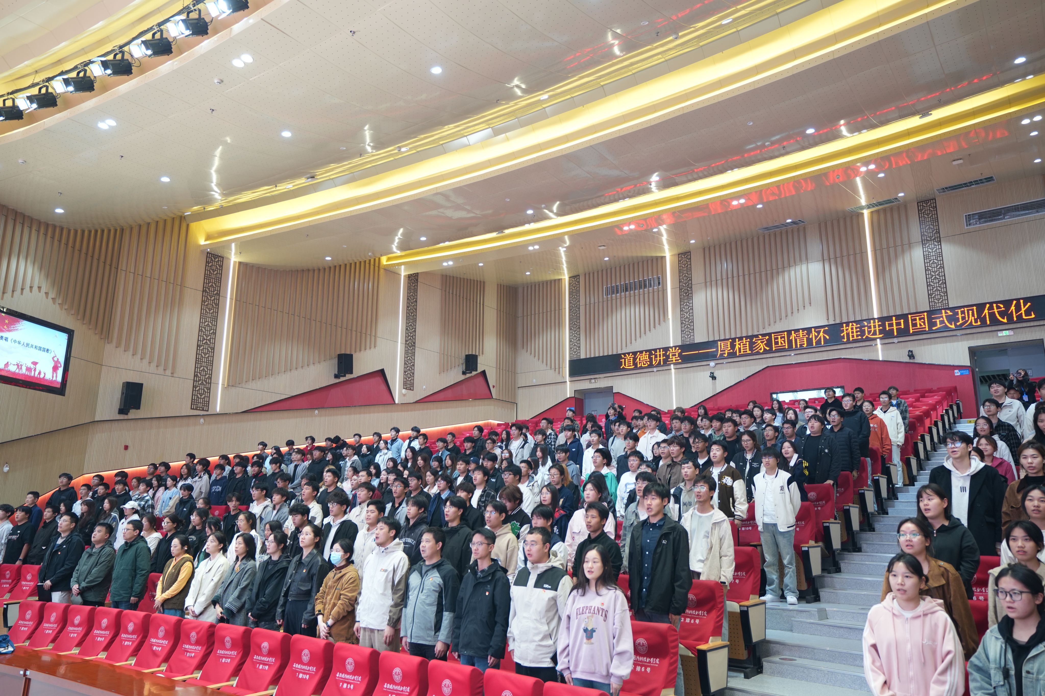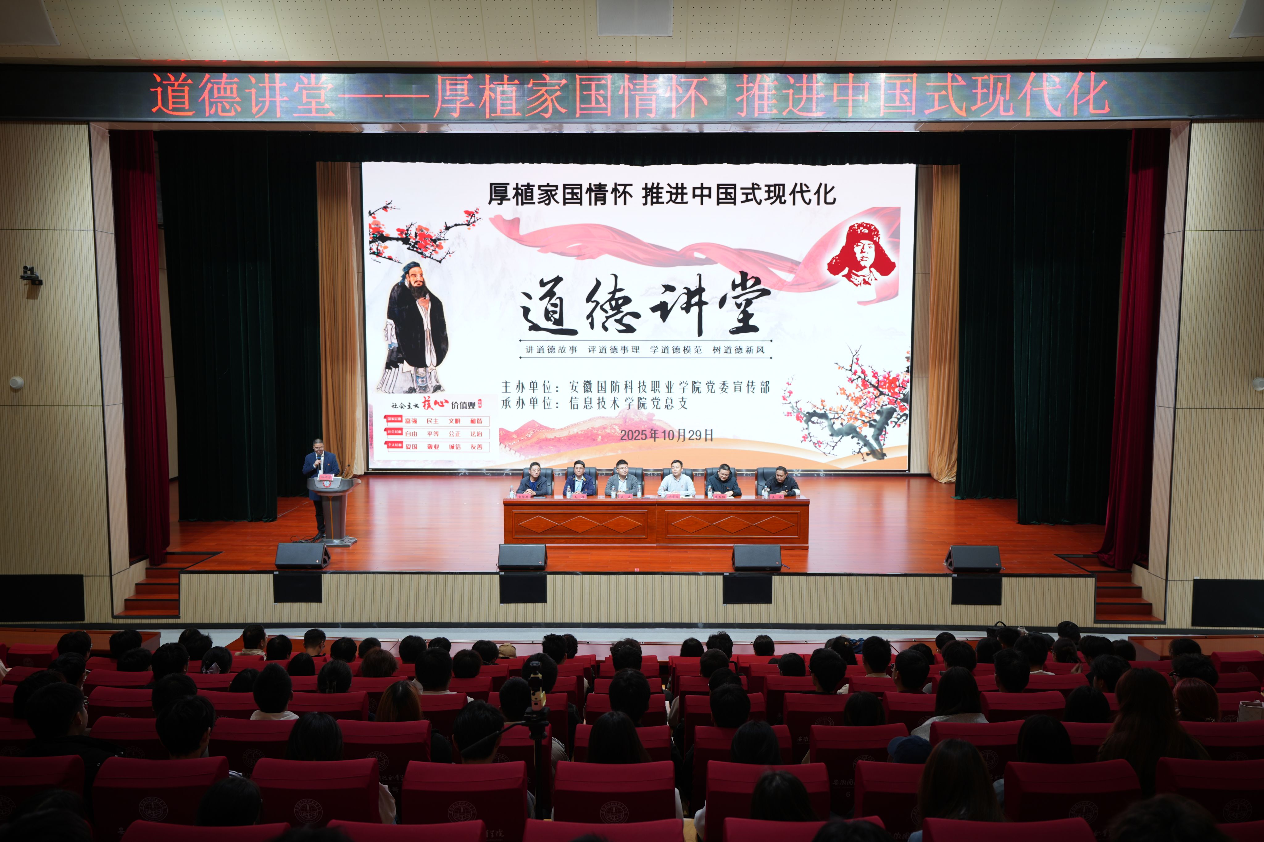 本网讯(信息技术学院 马士君)为热烈庆祝中华人民共和国成立76周年,持续深入学习贯彻习近平新时代中国特色社会主义思想和党的二十届四中全会精神,扎实培育和践行社会主义核心价值观,传承中华优秀传统文化,凝聚师生奋进力量,引导广大青年在推进中国式现代化建设中挺膺担当、建功立业,10月29日下午,由校党委宣传部主办、信息技术学院党总支承办的“厚植家国情怀 推进中国式现代化”主题道德讲堂在产教融合中心报告厅隆重举行。校党委委员、信息技术学院院长沙有闯,校党委宣传(统战)部副部长朱其阳,信息技术学院党总支书记王胜,副院长雷惊鹏,组织员吴伟等领导应邀出席,各二级学院师生代表共300余人参加了此次活动。活动由信息技术学院党总支副书记杜洪宇主持。