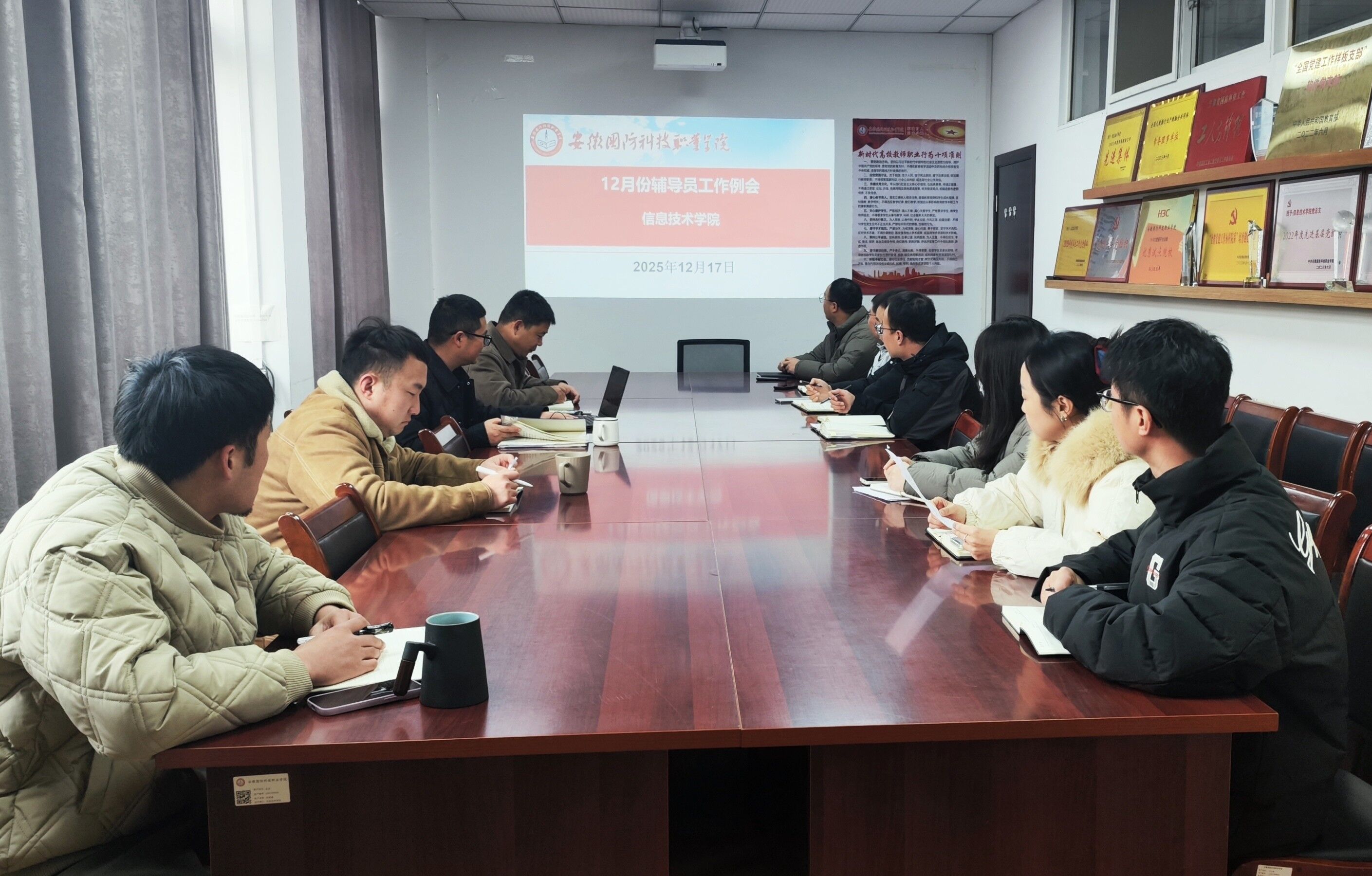 本网讯(信息技术学院 张浩博)12月17日,学院在知行楼304召开12月份辅导员工作例会。学院党总支书记王胜、全体在校班级专兼职辅导员参会,学院党总支副书记杜洪宇主持会议。