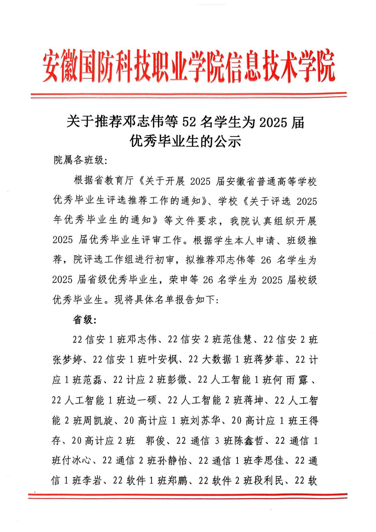 学院2025届省级、校级优秀毕业生拟推荐名单公示