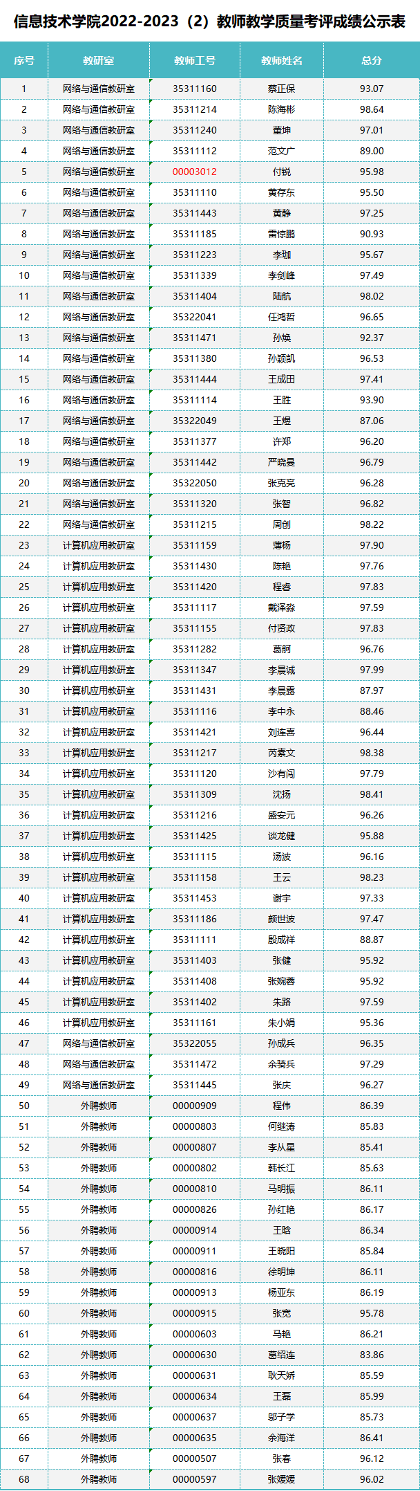 根据《beat365在线唯一官网教师教学质量考核评价办法(修订)》,信息技术学院2022-2023学年第二学期教学质量考评工作已经完成,现将考评成绩公示如下。