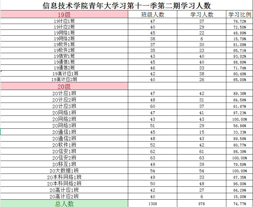根据《2021年学院共青团工作计划》(校团〔2021〕5号)及《信息技术学院关于开展 2020—2021 学年 第二学期班级主题团日活动的通知》(校信息学院团总支函〔2021〕1 号)文件精神,信息技术学院团总支积极组织各班级开展“青年大学习”网上主题团课的学习。现将第十一季第二期各班级学习情况进行公开公示,欢迎大家监督(监督电话:0564-3384332),具体学习情况明细如下: