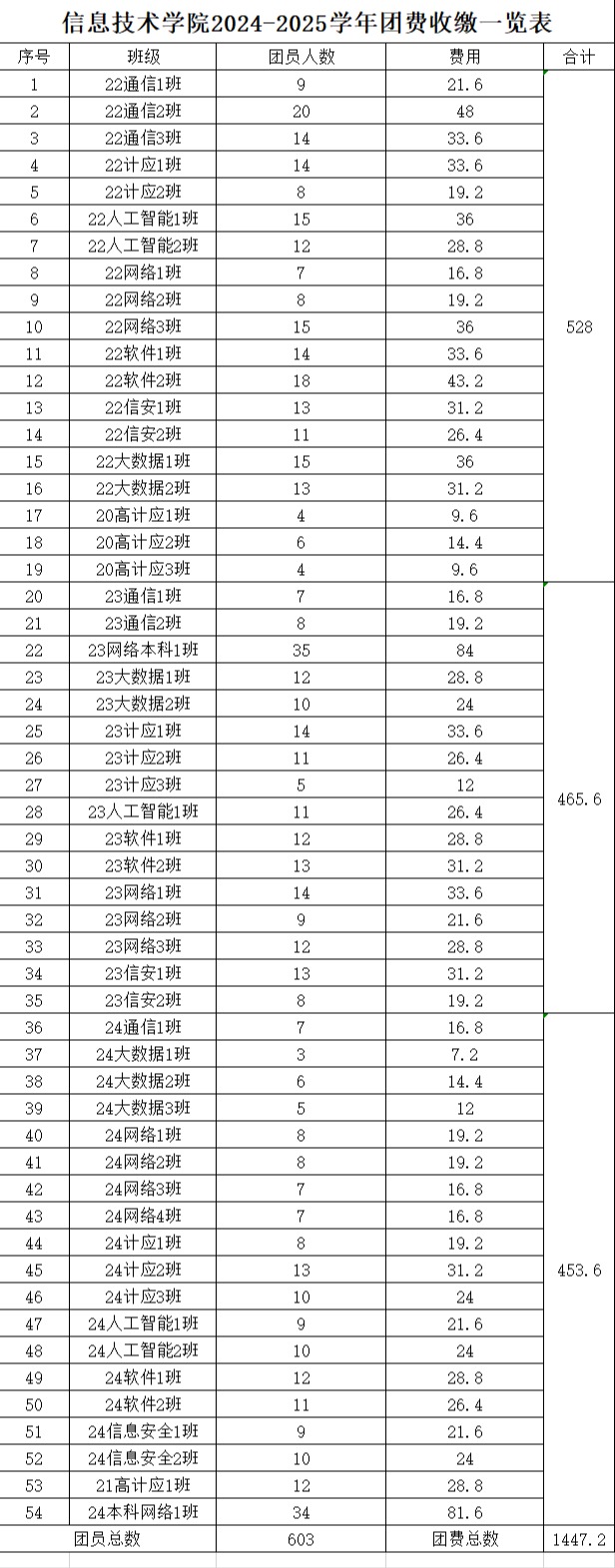 根据《中国共产主义青年团章程》及《共青团中央关于印发<关于中国共产主义青年团团费收缴、使用和管理的规定>的通知》文件精神,信息技术学院团总支于2024年11月完成了2024-2025学年各班级团费收缴工作,现将团费收缴情况进行公示,欢迎大家监督(监督电话:0564-3384332)。如下情况如下: