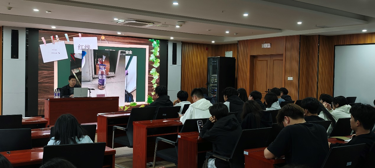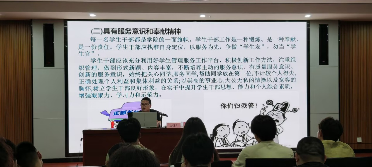 10月10日,学院党总支副书记杜洪宇以“校规校纪与学生干部行为准则”为主题,开宗明义将校规比作“校园文明说明书”,从礼仪倡导、安全保障等四个维度阐释其核心价值。结合男生宿舍违规吸烟引发火灾的案例,他系统梳理了宿舍安全等五类重点违规行为的处理标准,明确“警告”至“开除”的五级处分体系及审批流程,强调“处分非目的,保障安全与权益才是根本”。针对学生干部,他提出六项核心要求:严于律己、树立服务意识、平衡学业与工作、讲究工作方法、开展批评与自我批评、以公心维护和谐,并详细解析了活动组织全流程。