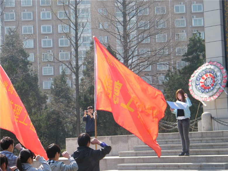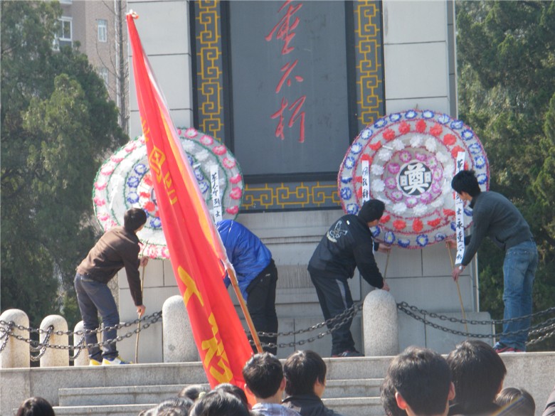 上午九时,祭扫活动正式开始。面对庄严肃穆的人民英雄纪念碑,同学们肃立默哀,向革命先烈们表达了最深切的哀思。随后各系学生代表向人民英雄纪念碑敬献了花圈,全体团员在纪念碑前重温了入团誓词。