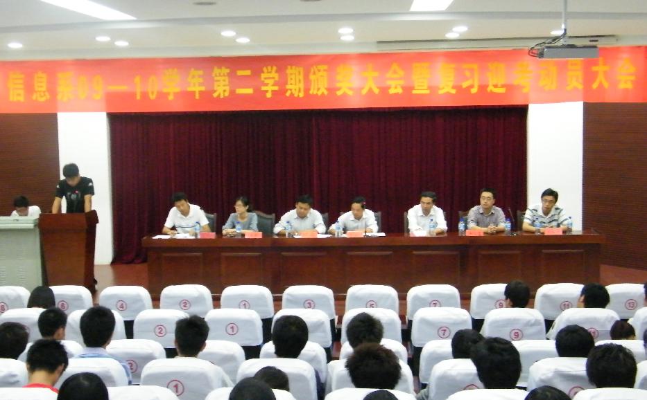为加强学风建设,表彰先进、诚信迎考,6月12日下午,我系在图书馆报告厅隆重召开09-10学年第二学期颁奖大会暨复习迎考动员大会,会议由团总支书记张伟业主持,系党总支书记梁继会、系主任黄存东参加了会议并讲话。参加会议还有系主任辅导员王文堂、辅导员刘严、杨旄袤、余桂刚、学生会干部、各班学生干部。