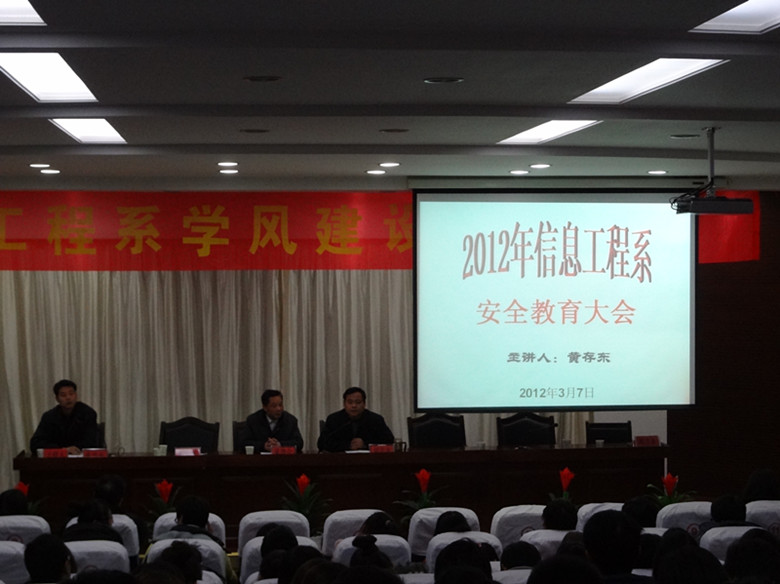 为保证校园和谐平安,增强学生自我防范意识,3月7日下午,信息工程系在报告厅召开了2012年度首次学生安全教育大会,大会由系团总支书记张伟业主持,系党总支书记梁继会、系主任黄存东与系学生工作管理人员出席了大会,全系学生干部和各班级寝室长参加了大会。
