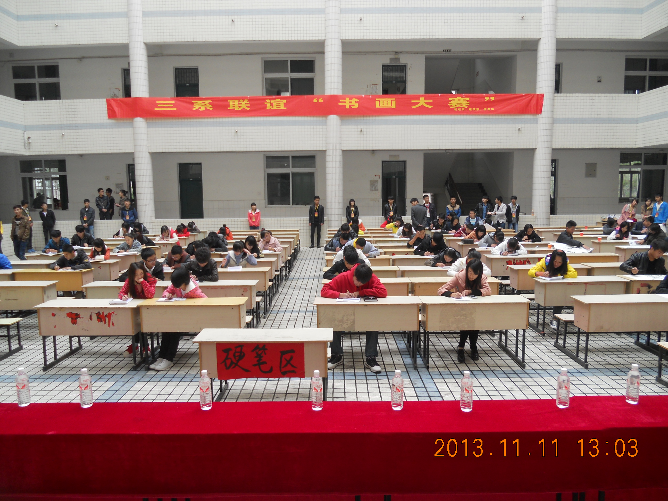 11月11日,由信息工程系,管理工程系,建筑工程系学生会联合举办的“三系联谊”书画大赛在教学楼天井举行。 此次书画大赛为挖掘13级新生书画才能,展示自我才艺的舞台,丰富校园文化生活,营造浓厚的校园文化为目的,以“春色染五湖,激情洋溢;青墨点九州,意气风发”为主题。不仅给三系新生提供了一个自我展现的平台,还促进了书画爱好者之间的交流,从而进一步提升他们的文化修养、审美情趣,营造出浓厚的校园文化氛围。(供稿:唐纾泓)