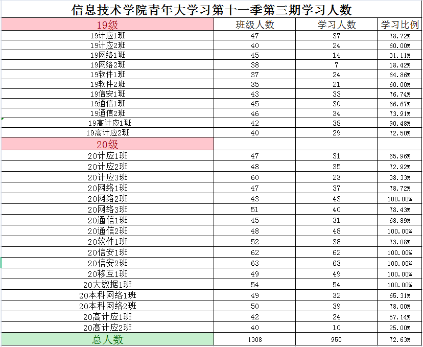 根据《2021年学院共青团工作计划》(校团〔2021〕5号)及《信息技术学院关于开展 2020—2021 学年 第二学期班级主题团日活动的通知》(校信息学院团总支函〔2021〕1 号)文件精神,信息技术学院团总支积极组织各班级开展“青年大学习”网上主题团课的学习。现将第十一季第一期各班级学习情况进行公开公示,欢迎大家监督(监督电话:0564-3384332),具体学习情况明细如下: