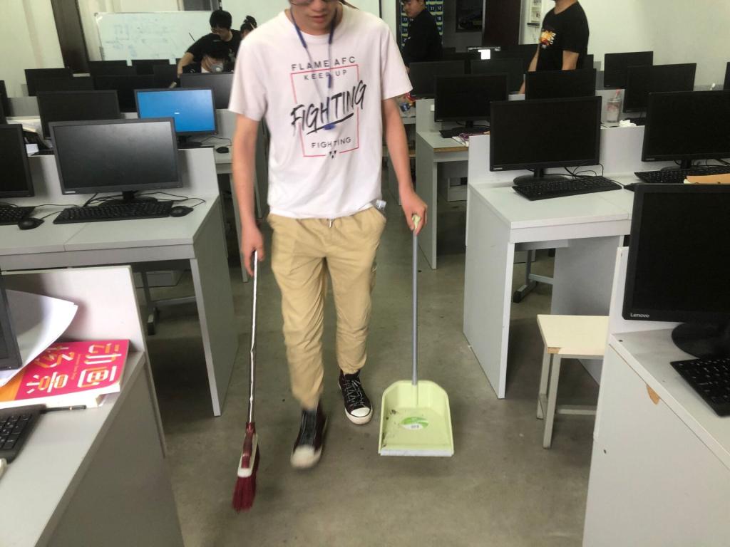 在本次志愿打扫的过程中,动漫协会的干事不分部门,不分你我,互相帮助。首先清理机房上遗留的桌面垃圾,然后使用抹布将机房桌面清理干净,最后打扫机房的地面卫生并将垃圾打包带走。