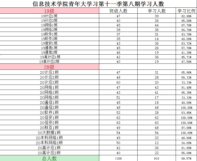 根据《2021年学院共青团工作计划》(校团〔2021〕5号)及《信息技术学院关于开展 2020—2021 学年 第二学期班级主题团日活动的通知》(校信息学院团总支函〔2021〕1 号)文件精神,信息技术学院团总支积极组织各班级开展“青年大学习”网上主题团课的学习。现将第十一季第八期各班级学习情况进行公开公示,欢迎大家监督(监督电话:0564-3384332),具体学习情况明细如下: