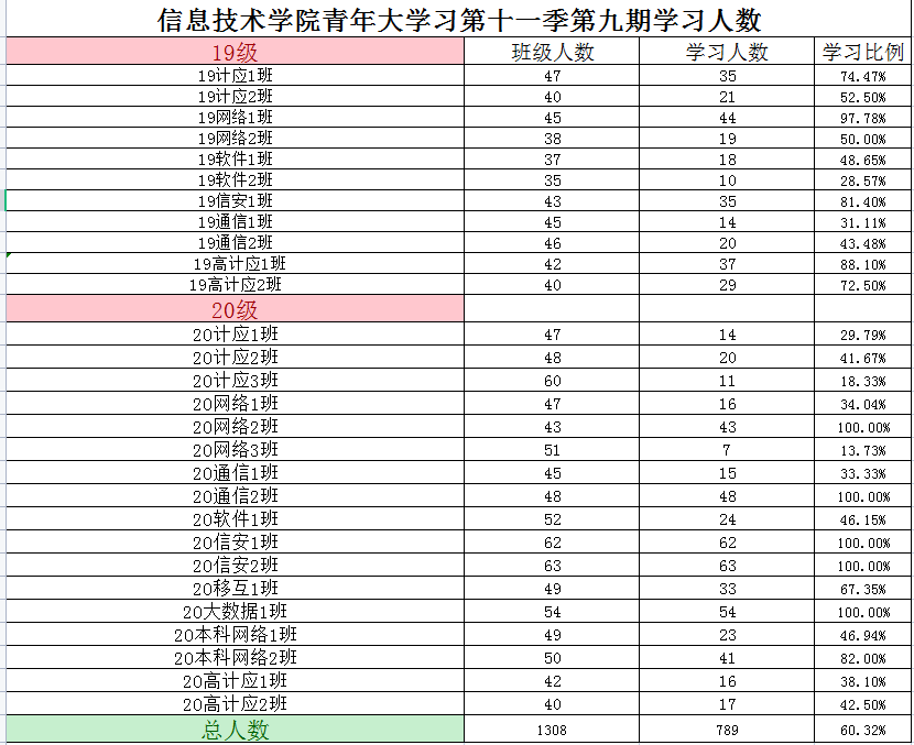 根据《2021年学院共青团工作计划》(校团〔2021〕5号)及《信息技术学院关于开展 2020—2021 学年 第二学期班级主题团日活动的通知》(校信息学院团总支函〔2021〕1 号)文件精神,信息技术学院团总支积极组织各班级开展“青年大学习”网上主题团课的学习。现将第十一季第九期各班级学习情况进行公开公示,欢迎大家监督(监督电话:0564-3384332),具体学习情况明细如下: