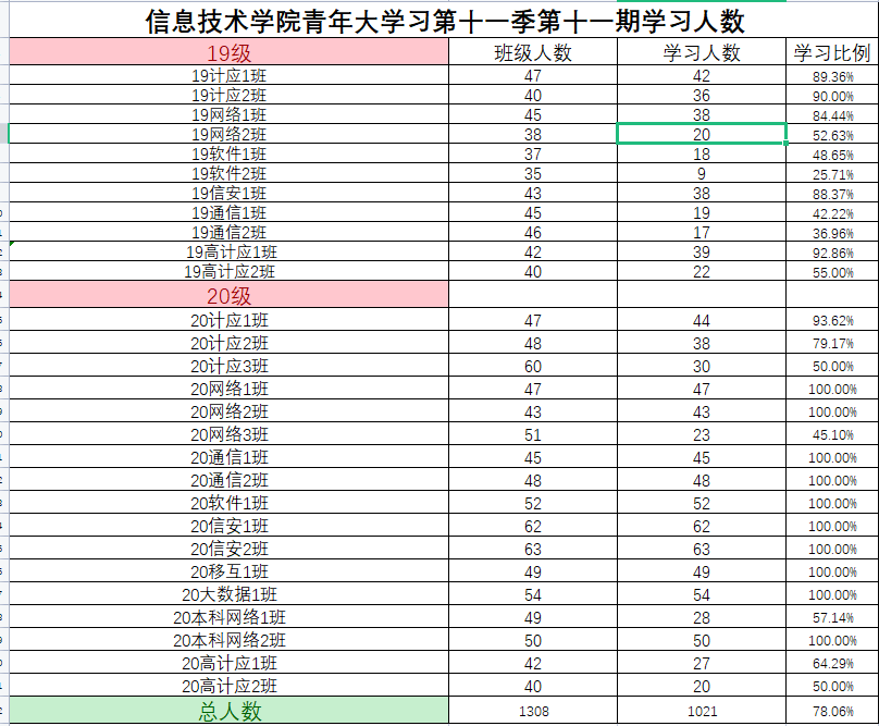 根据《2021年学院共青团工作计划》(校团〔2021〕5号)及《信息技术学院关于开展 2020—2021 学年 第二学期班级主题团日活动的通知》(校信息学院团总支函〔2021〕1 号)文件精神,信息技术学院团总支积极组织各班级开展“青年大学习”网上主题团课的学习。现将第十一季第十一期各班级学习情况进行公开公示,欢迎大家监督(监督电话:0564-3384332),具体学习情况明细如下: