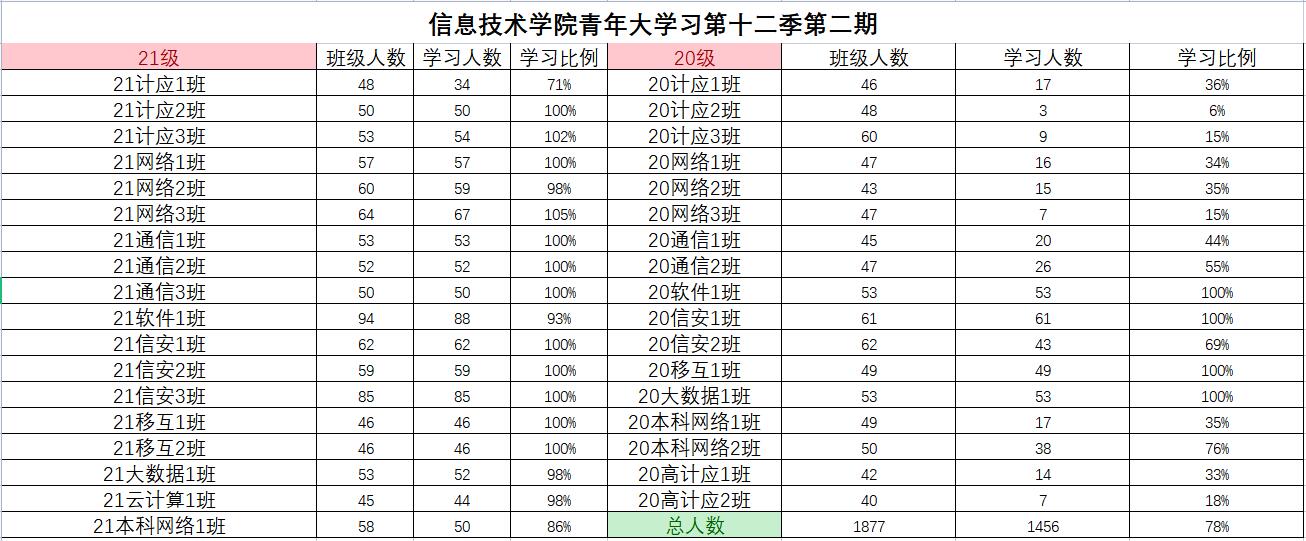 根据《2021年学院共青团工作计划》(校团〔2021〕5号)及《信息技术学院关于开展 2021—2022 学年 第一学期班级主题团日活动的通知》(校信息学院团总支函〔2021〕1 号)文件精神,信息技术学院团总支积极组织各班级开展“青年大学习”网上主题团课的学习。现将第十二季第二期各班级学习情况进行公开公示,欢迎大家监督(监督电话:0564-3384332),具体学习情况明细如下: