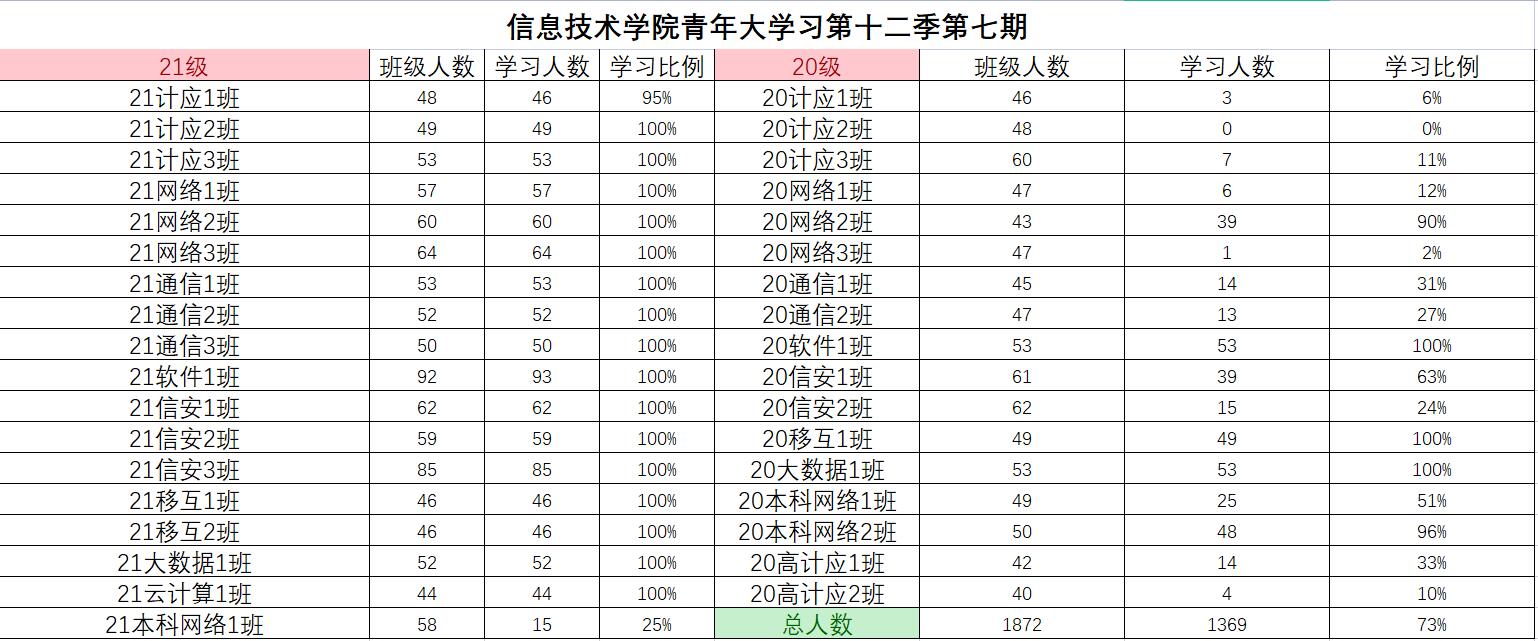 根据《2021年学院共青团工作计划》(校团〔2021〕5号)及《信息技术学院关于开展 2021—2022 学年 第一学期班级主题团日活动的通知》(校信息学院团总支函〔2021〕1 号)文件精神,信息技术学院团总支积极组织各班级开展“青年大学习”网上主题团课的学习。现将第十二季第七期各班级学习情况进行公开公示,欢迎大家监督(监督电话:0564-3384332),具体学习情况明细如下: