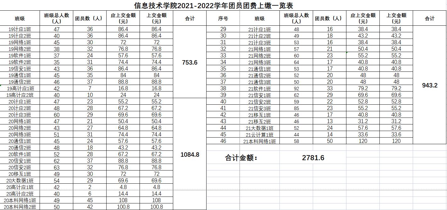 根据《中国共产主义青年团章程》及《共青团中央关于印发<关于中国共产主义青年团团费收缴、使用和管理的规定>的通知》文件精神,信息技术学院团总支于2021年11月完成了2021-2022学年各班级团费收缴工作,现将团费收缴情况公示如下: