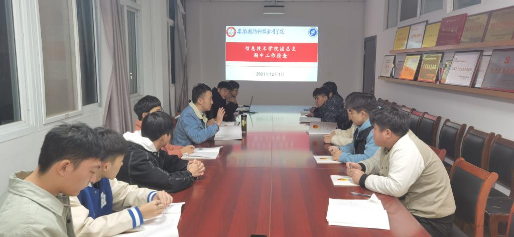本网讯(信息技术学院团总支)为进一步推进我院基层团组织规范化、制度化建设,加强团支部工作指导,记录支部建设各方面的具体情况,提高基层团组织的工作水平,完善和规范学院团务工作机制。信息技术学院于12月1日晚在知行楼304会议室开展本学期团务工作期中检查。学院2019级辅导员孙颖凯参于本次检查。