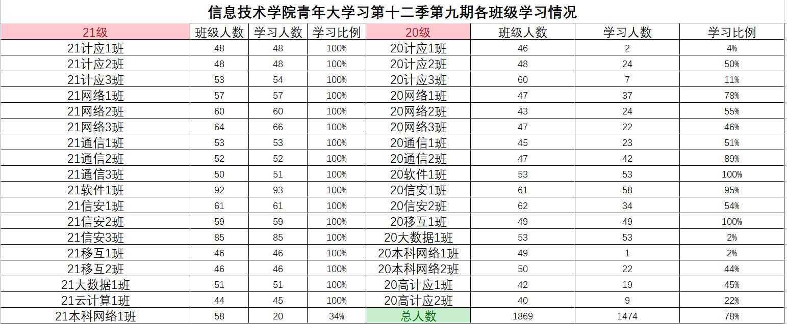 根据《2021年学院共青团工作计划》(校团〔2021〕5号)及《信息技术学院关于开展 2021—2022 学年 第一学期班级主题团日活动的通知》(校信息学院团总支函〔2021〕1 号)文件精神,信息技术学院团总支积极组织各班级开展“青年大学习”网上主题团课的学习。现将第十二季第九期各班级学习情况进行公开公示,欢迎大家监督(监督电话:0564-3384332),具体学习情况明细如下: