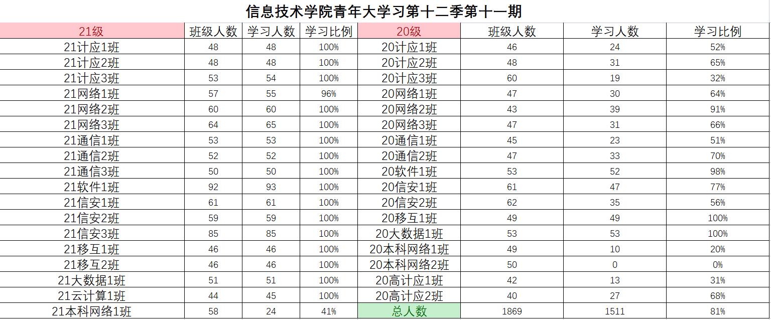 根据《2021年学院共青团工作计划》(校团〔2021〕5号)及《信息技术学院关于开展 2021—2022 学年 第一学期班级主题团日活动的通知》(校信息学院团总支函〔2021〕1 号)文件精神,信息技术学院团总支积极组织各班级开展“青年大学习”网上主题团课的学习。现将第十二季第十一期各班级学习情况进行公开公示,欢迎大家监督(监督电话:0564-3384332),具体学习情况明细如下: