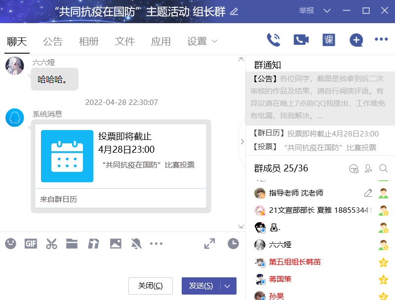 活动接近尾声时,同学们在群相册欣赏优秀作品,并给自己喜欢的视频进行投票,同学间相互学习交流。动漫协会各部门人员也认真统计资料并维持线上秩序,让活动井然有序的进行。