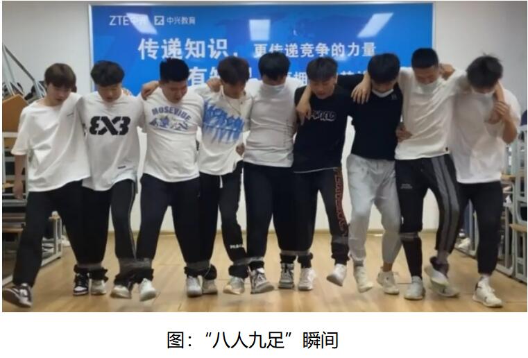 最后是“八人九足”,组内所有人站成一排,将相邻两人的腿绑到一起,所有人一起跑向终点,用时最短的队伍获胜。