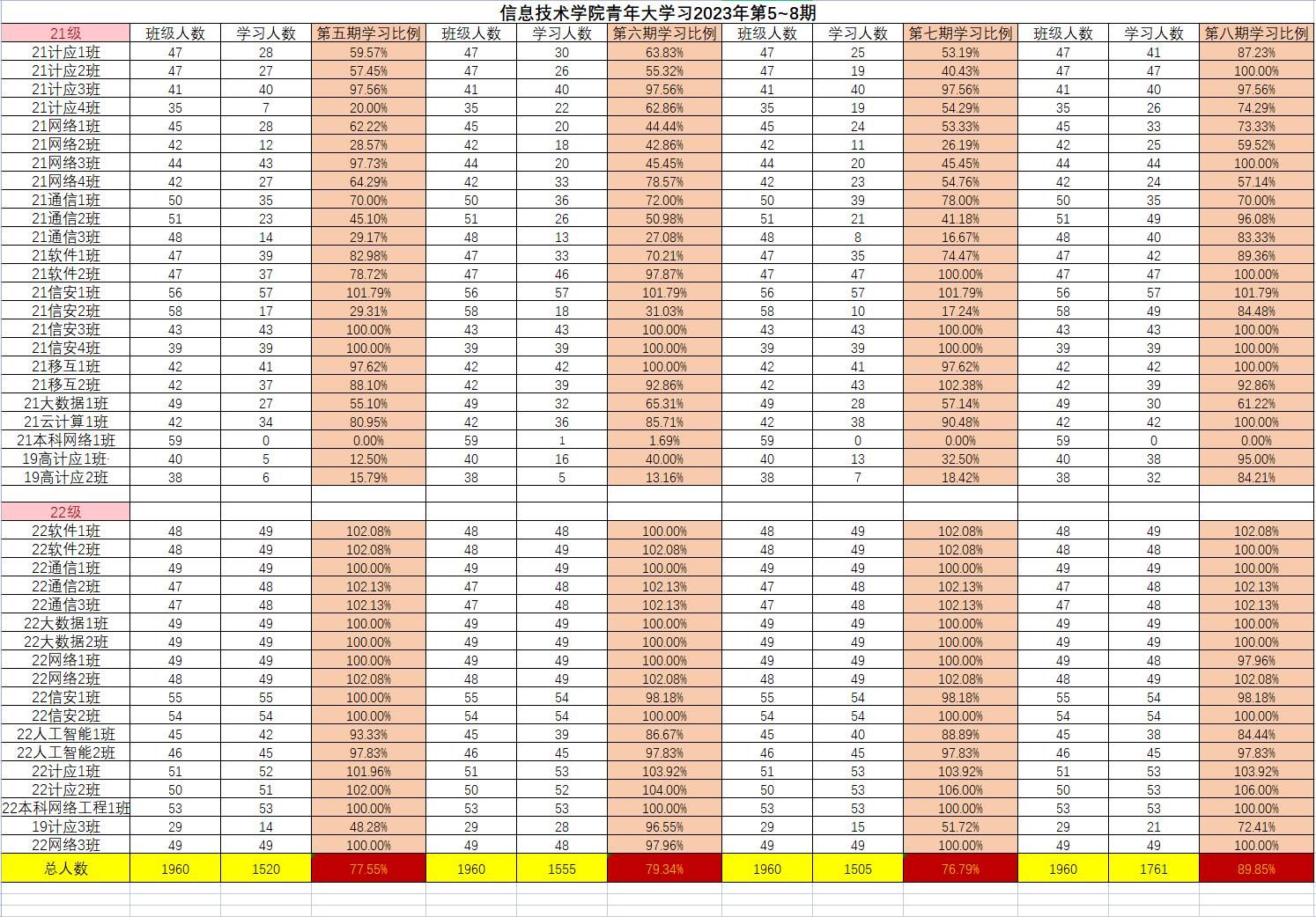 根据信息技术学院《关于开展2022-2023学年第二学期班级主题团日活动的通知》(校信息学院团总支函〔2023〕2 号)文件精神,信息技术学院团总支积极组织各班级开展“青年大学习”网上主题团课的学习。现将2023年第五至第八期各班级学习情况进行公开公示,欢迎大家监督(监督电话:0564-3384332),具体学习情况明细如下: