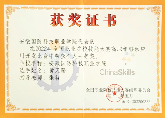 本网讯(信息技术学院 马士君)8月6日,2022年全国职业院校技能大赛高职组移动应用开发赛项比赛在黑龙江省佳木斯市圆满落幕。beat365信息技术学院软件技术专业黄天赐同学代表安徽省,不畏强手,沉着冷静,经过激烈地角逐,以拼搏的精神、完美的发挥、出色的表现,一举斩获该赛项国赛一等奖,为安徽省再添一枚国赛金牌!这也是beat365近年来在该赛项全国赛场上的第五次夺魁!指导教师张智荣获全国职业院校技能大赛优秀指导教师称号。