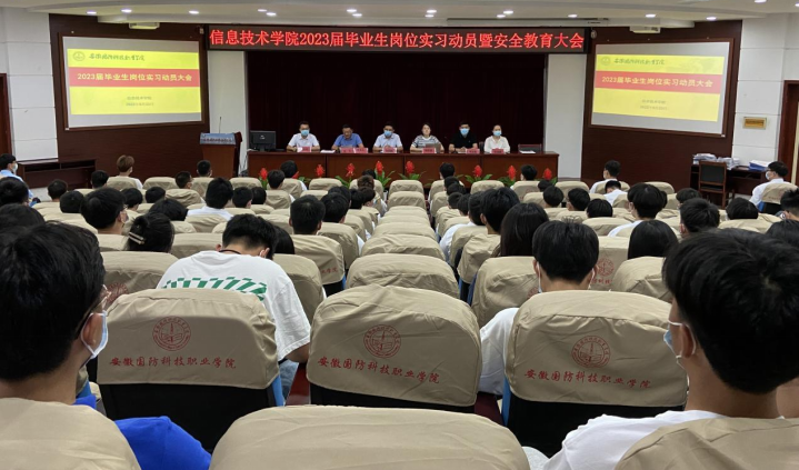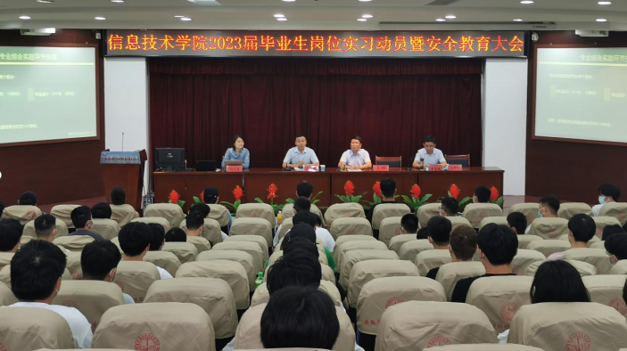 5月22日下午,信息技术学院2023届毕业生岗位实习动员暨安全教育大会在图书馆报告厅成功举办。校党委委员、信息技术学院院长沙有闯、信息技术学院党总支书记王胜、信息技术学院副院长雷惊鹏、信息技术学院党总支副书记杨庆颖、各班级班主任出席会议。会议由信息技术学院副院长雷惊鹏主持,2023届全体600多名在校生按照不同专业分五批次参会。