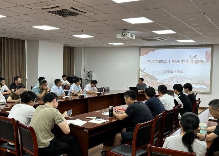 本网讯(信息技术学院 马士君)为深入学习贯彻落实党的二十届三中全会精神,推进学院教育教学工作高质量发展。9月11日下午,在秉心楼902会议室,学院党总支书记王胜为全体党员同志讲授题为《学习党的二十届三中全会精神》的专题党课。学院领导班子及全体教师党员、学生党员50余人参加了会议。