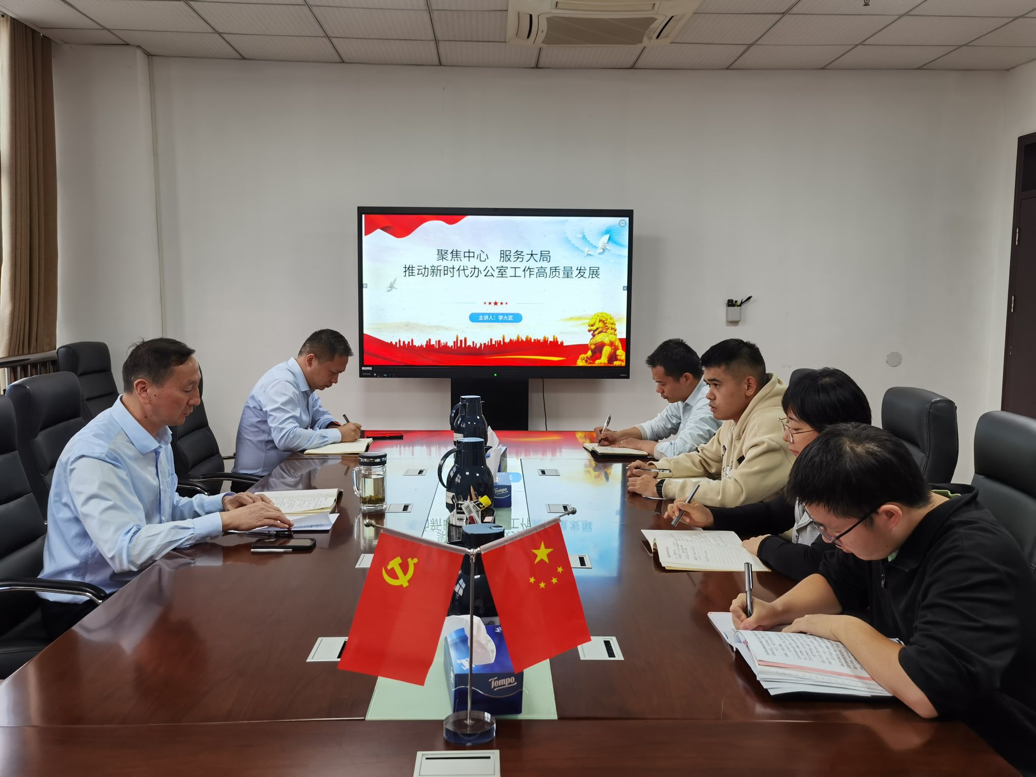 为深入学习贯彻党的二十大精神,进一步坚定支部党员理想信念,强化纪律意识、底线意识,提振支部党员务实担当、履职尽责的精气神,10月25日下午,党政办公室支部在秉心楼党委会议室开展了题为“聚焦中心 服务大局——推动新时代办公室工作高质量发展”的专题党课,党课由党政办公室主任李大武主讲,支部全体党员参加学习。