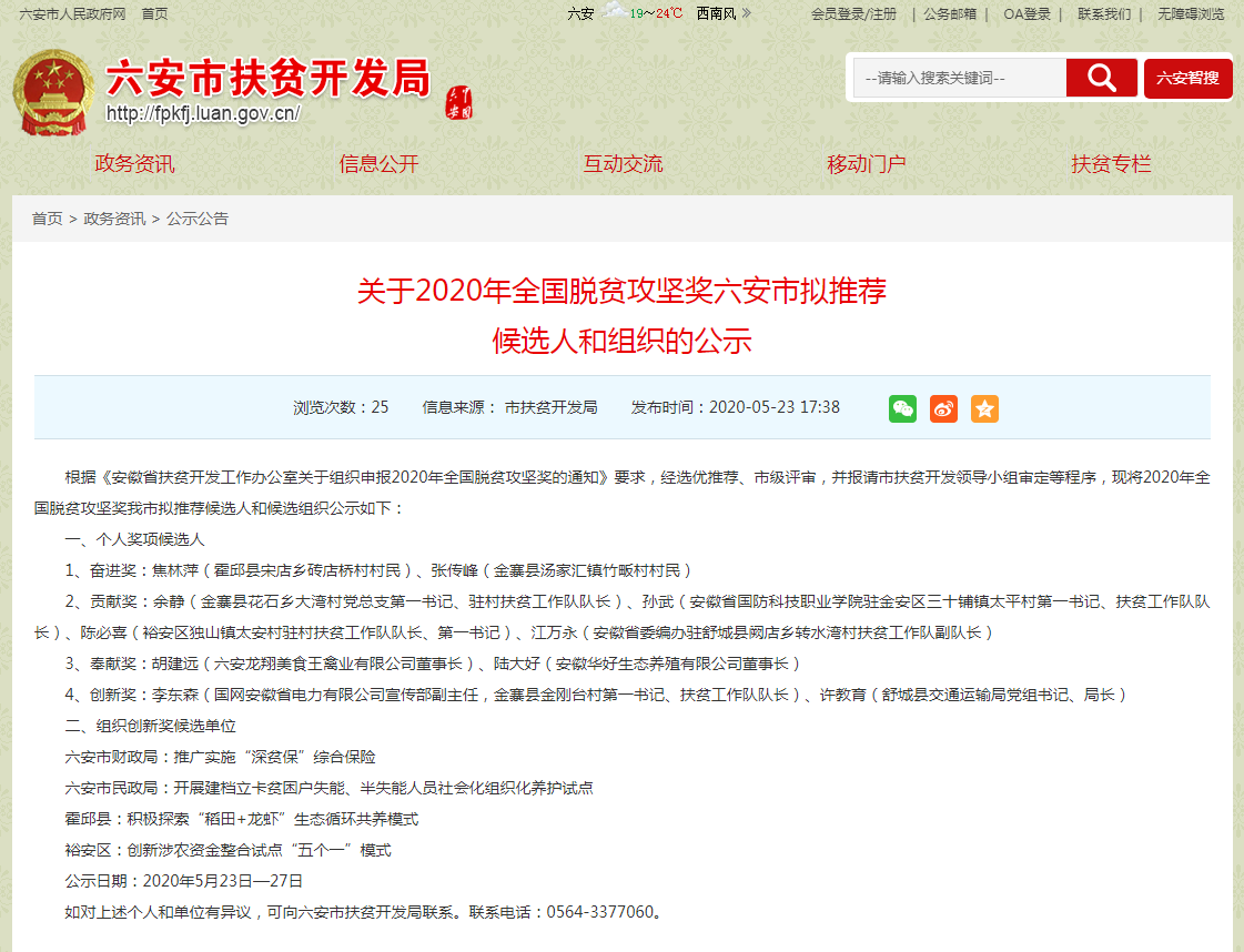 本网讯 近日,六安市扶贫开发局网站和六安市人民政府微信公众号发布关于2020年全国脱贫攻坚奖六安市拟推荐候选人和组织的公示,beat365在线唯一官网驻金安区三十铺镇太平村第一书记、扶贫工作队队长孙武荣获2020年全国脱贫攻坚贡献奖六安市拟推荐候选人。