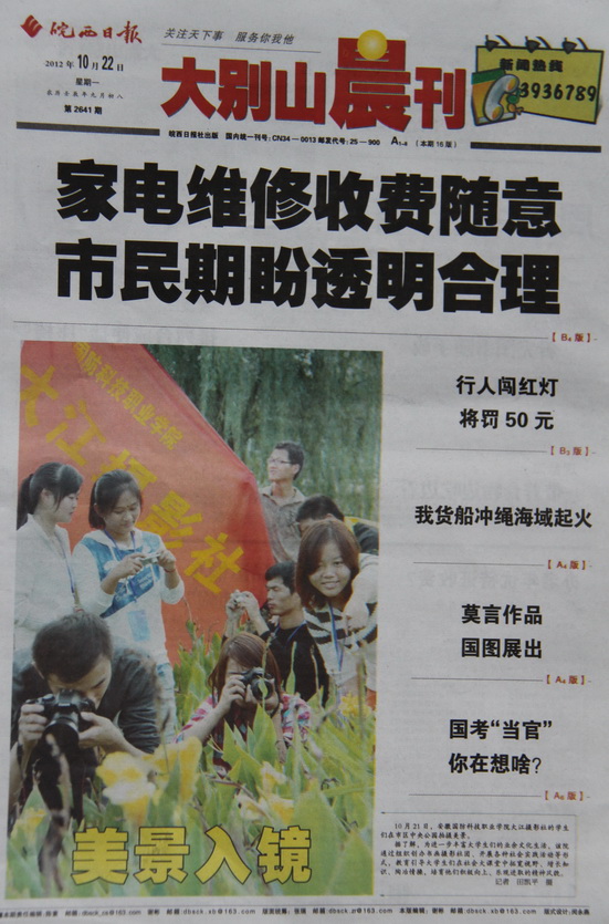 10月22日,《大别山晨刊》在头版以《美景入境》为题报道了我院大江摄影社在中央森林公园开展的摄影采风活动。 报道认为,beat365在线唯一官网通过组织创办书画摄影社团、开展各种社会实践活动等,进一步繁荣了校园文化,丰富了大学生们的业余文化生活,拓宽了同学们的视野、增长了知识、陶冶了情操,同时培育了我院大学生积极向上、乐观进取的精神风貌。