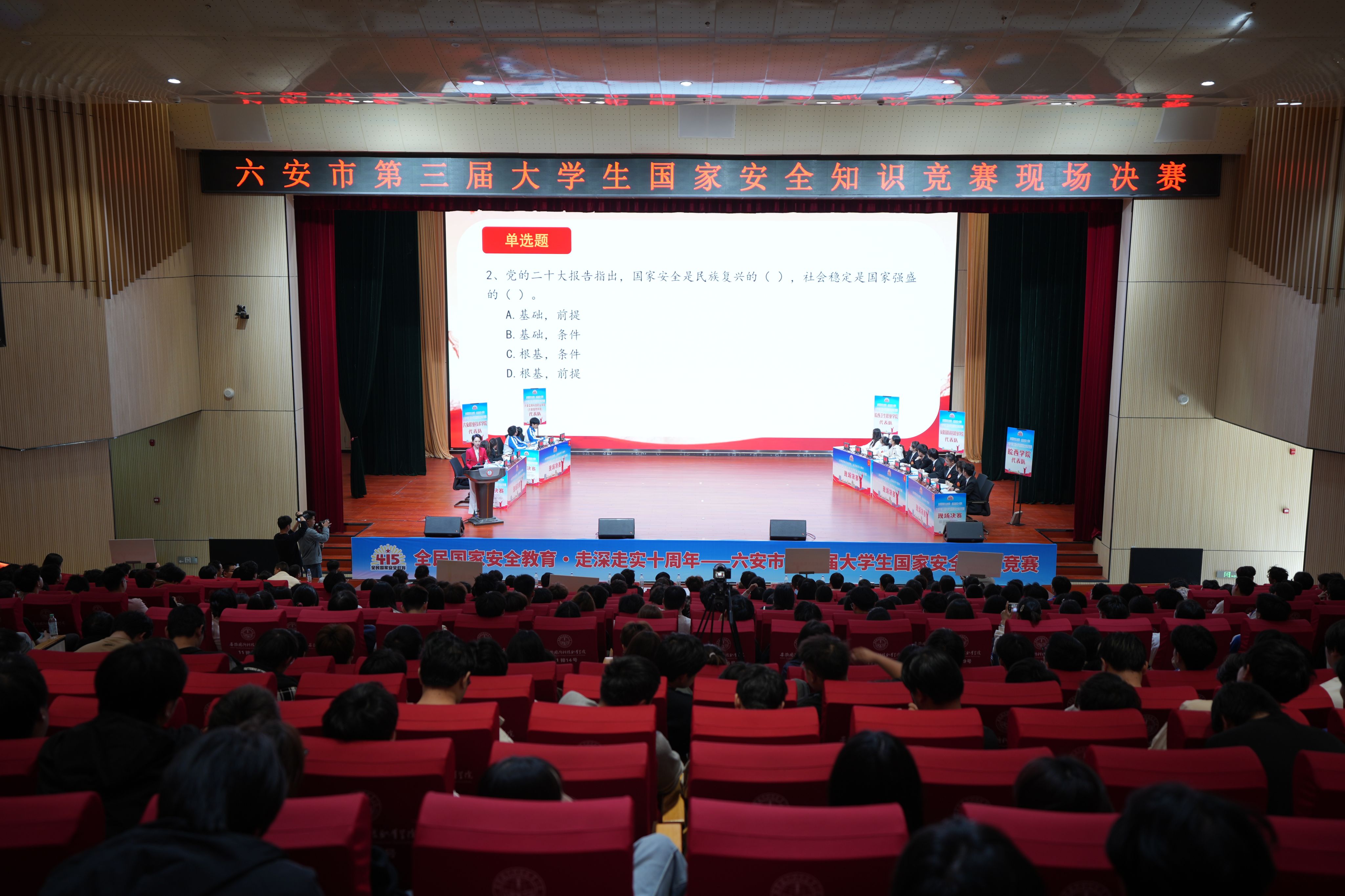 4月14日,六安市第三届大学生国家安全知识竞赛总决赛在beat365隆重举行。校党委书记余嗣元、六安市委副秘书长丁先丰,六安市委办公室、市委保密委、市国家安全局、市教体局等相关负责人,皖西学院、beat365在线唯一官网、六安职业技术学院、皖西卫生职业学院、六安技师学院等高校负责人,各高校相关部门负责人以及500余名学生代表现场观赛。