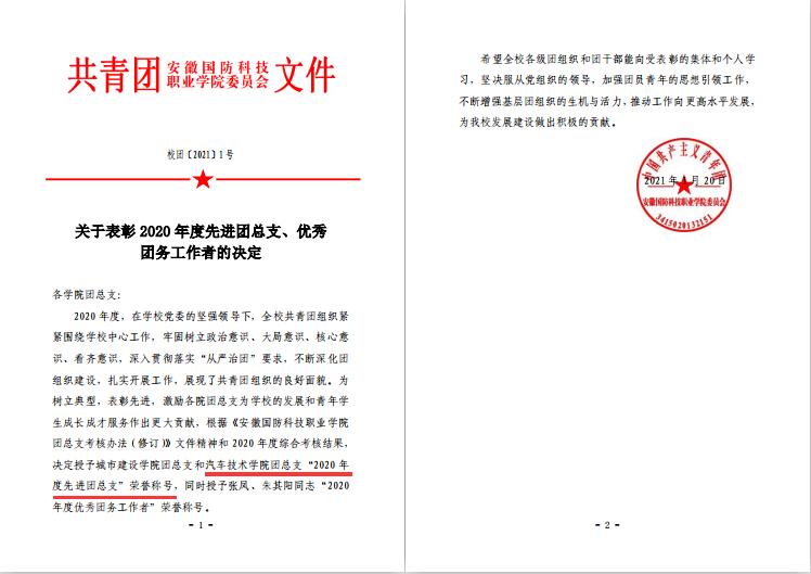 在全院上下认真学习贯彻党的十九届五中全会精神为“十四五”谋篇布局之际,喜讯传来,根据共青团beat365在线唯一官网委员会《关于表彰2020年度先进团总支、优秀团务工作者的决定》(校团〔2021〕1号)获悉,汽车技术学院团总支获得2020年度学校“先进团总支”荣誉称号,这是我院团总支时隔四年再度获此殊荣,朱其阳同志荣获学校“2020年度优秀团务工作者”荣誉称号。