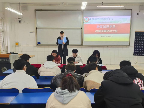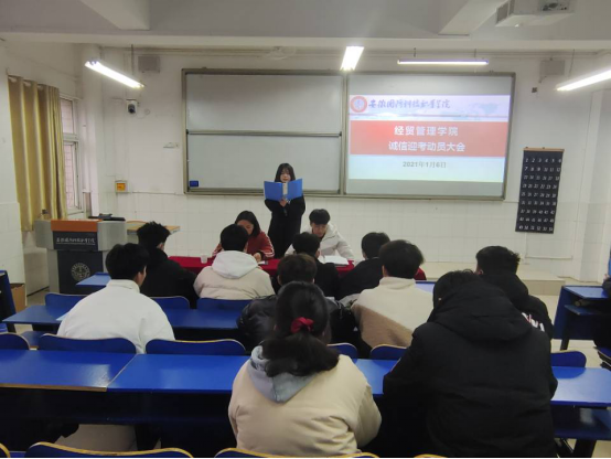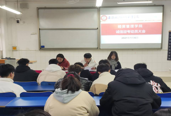 1月6日经贸管理学院团总支在2教105教室召开诚信迎考动员大会,团总支书记付玉梅、学生会主席团、各班班干及学生会全体成员参加此次动员会,会议由第十六届学生会主席葛恒同学主持。
