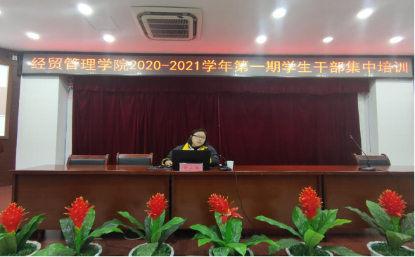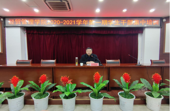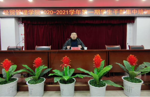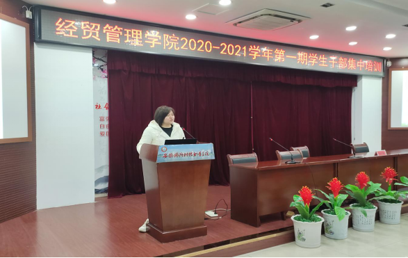 为加强学生干部队伍建设,12月7日至12月10日,经贸管理学院在图书馆报告厅举行2020—2021学年第一期学生干部集中培训。院党总支书记杜先杨,党总支副书记刘峰,团总支书记付玉梅,辅导员许凤麟应邀参与本次培训并开展专题讲座,经贸管理学院第十六届团总支学生会全体成员、班级主要学生干部及院属社团负责人共151人参加培训。