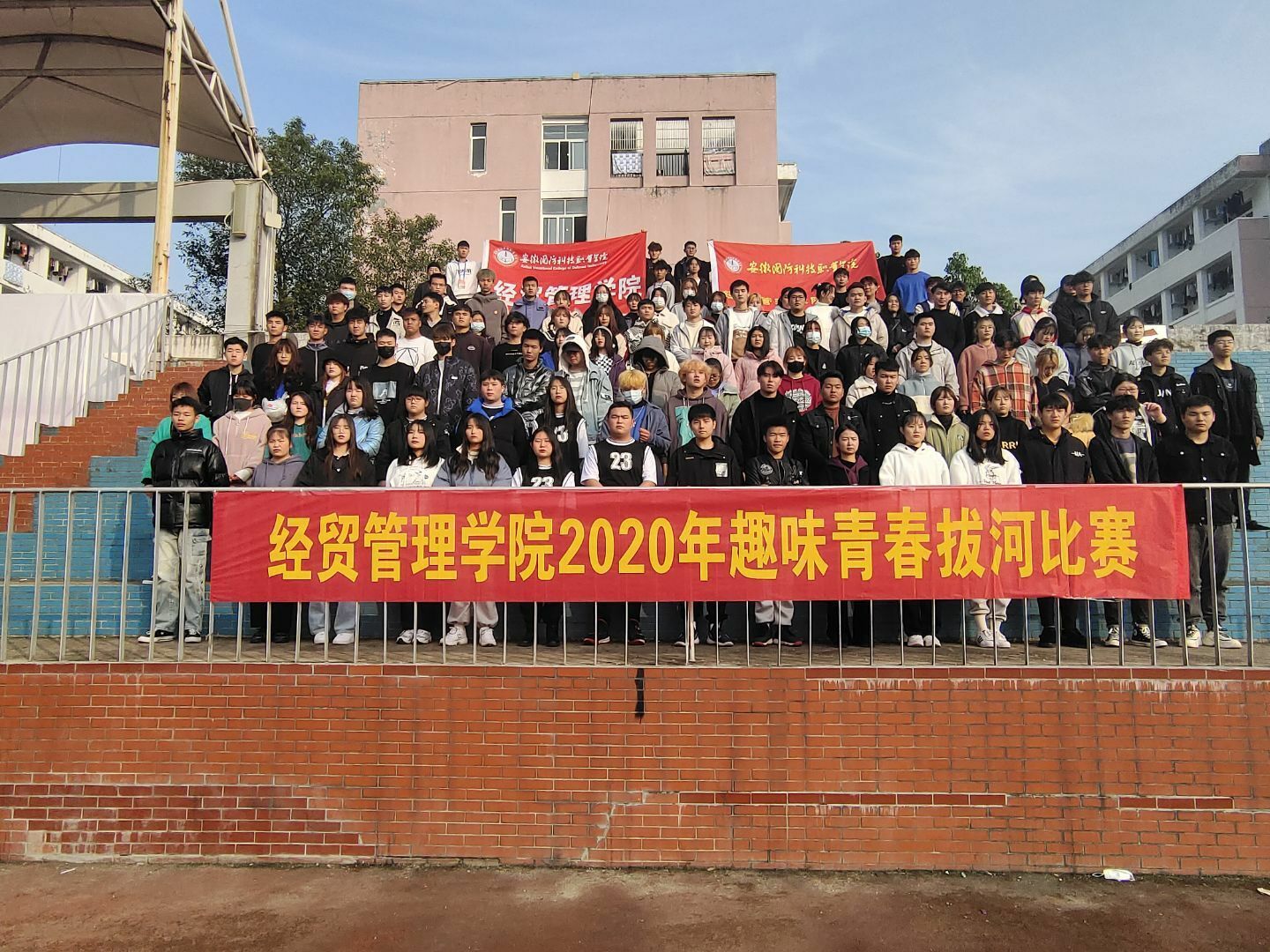 为丰富学院学生的课余时间,增强学生体育锻炼的意识,增强学生班级集体凝聚力,经贸管理学院于2020年11月29日下午在田径操场特展开趣味青春拔河比赛。
