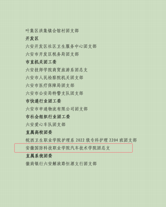 汽车技术学院团总支获“六安市五四红旗团总支部”荣誉称号
